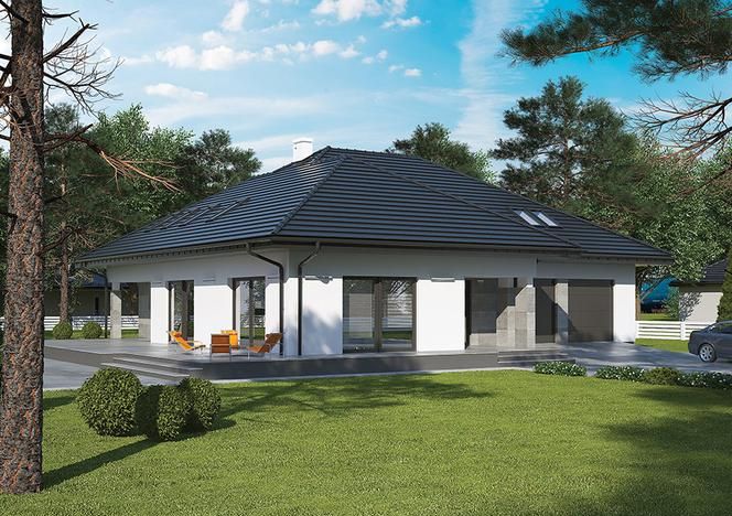 Ово је једноспратна зграда посебно дизајнирана за плацу са улазом са јужне стране. Најбоље је за велико земљиште на којем га можете гурнути колико год је то могуће. Велики дневни боравак у комбинацији са кухињом има прозоре и терасовна врата окренута према југу и западу. Пространа тераса окружује је са обје стране. Можете да користите његов део у зависности од потреба и доба дана. Тело гараже стрши према напријед захваљујући чему покрива улазну зону спојену са јужном терасом. Љети се гости могу одмах дочекати на овој тераси и позвати их да посјете башту. У северном делу куће налазе се спаваће собе и купатило.